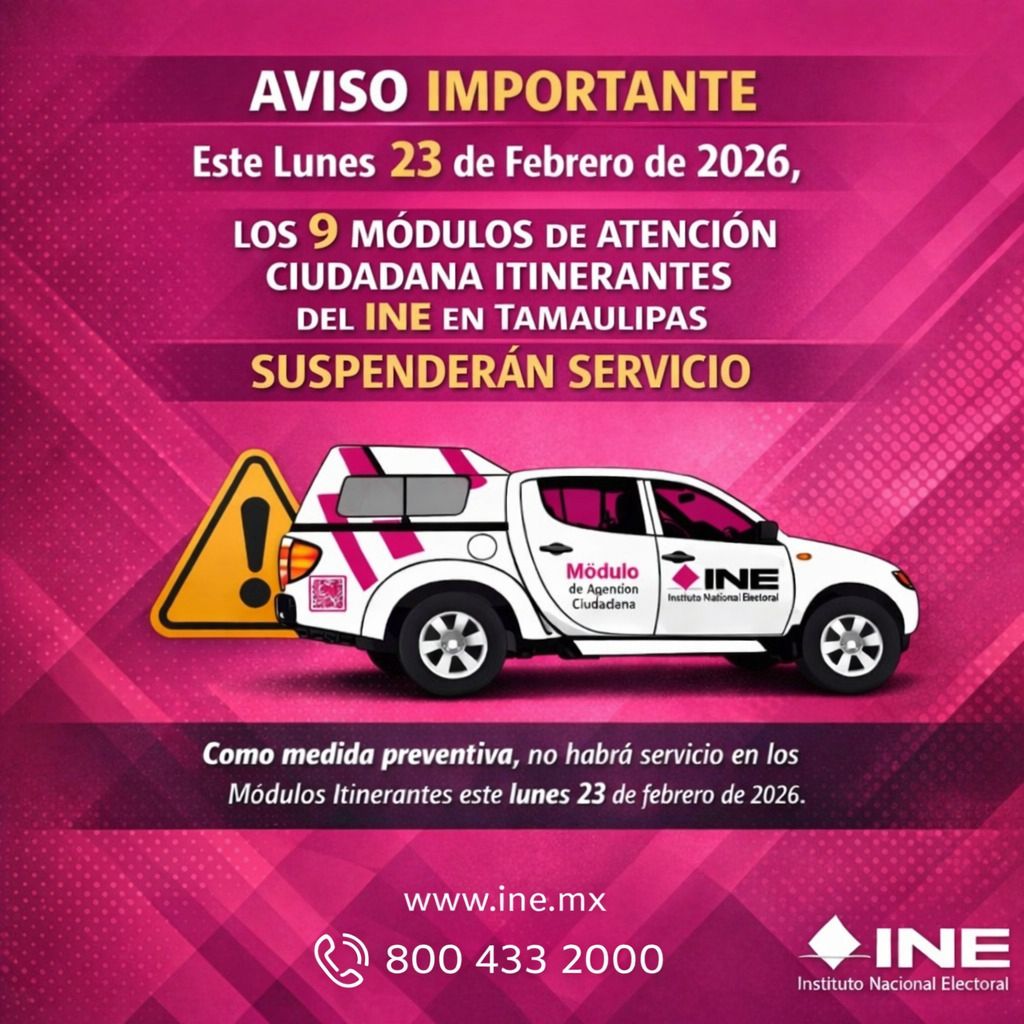 El Instituto Nacional Electoral (INE) informó que este lunes 23 de febrero de 2026 se suspenderá el servicio en los módulos de atención ciudadana itinerantes en Tamaulipas, como medida preventiva.
