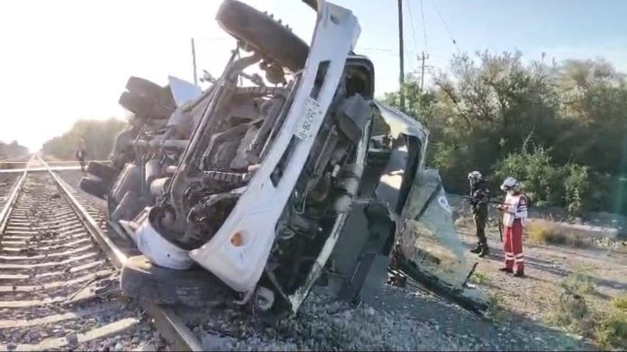 De acuerdo con los primeros reportes, la unidad de transporte fue impactada por la locomotora y terminó volcada a un costado de las vías. En el lugar se confirmó que los ocupantes del camión ya no contaban con signos vitales tras la colisión.