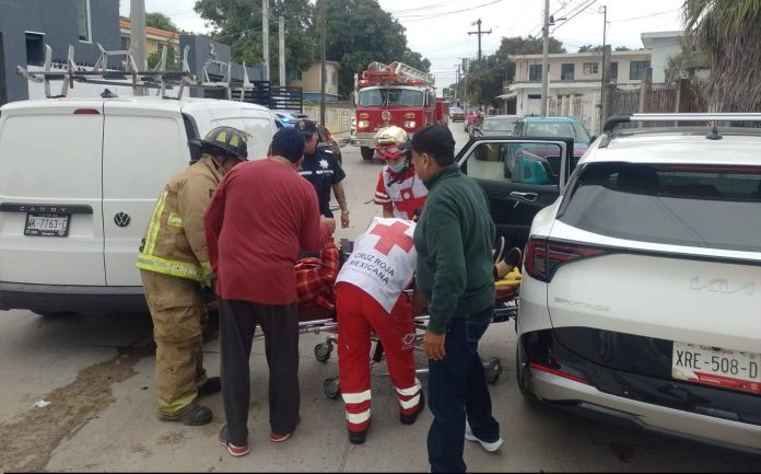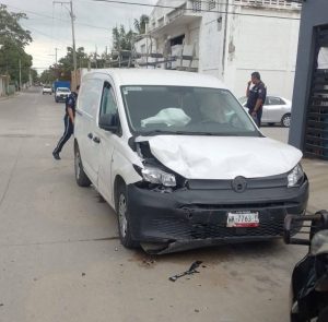 El percance ocurrió en el cruce de las calles Mango y México, donde una camioneta Volkswagen Caddy color blanco colisionó contra el costado izquierdo de una Kia Sportage del mismo color, provocando que la conductora de esta última quedara atrapada dentro de la unidad debido a que la puerta del conductor quedó inutilizada por el impacto.