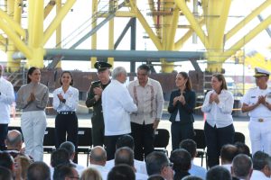 Durante el evento celebrado en el Patio Industrial de Pueblo Viejo, Veracruz, y junto a la gobernadora anfitriona Rocío Nahle García, al pie de las nuevas plataformas petroleras marinas construidas por Petróleos Mexicanos, la presidenta Claudia Sheinbaum destacó la presencia de Américo Villarreal, a quien consideró “un hombre nacionalista y visionario”.