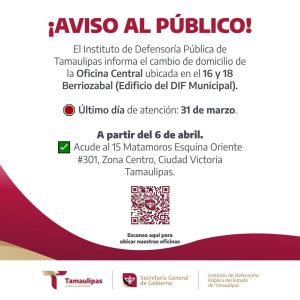 Ciudad Victoria, Tamaulipas.– El Instituto de Defensoría Pública del Estado de Tamaulipas informa a la ciudadanía sobre el cambio de domicilio de sus oficinas en Ciudad Victoria, con el objetivo de fortalecer la atención y mejorar los servicios jurídicos que se brindan a la población.