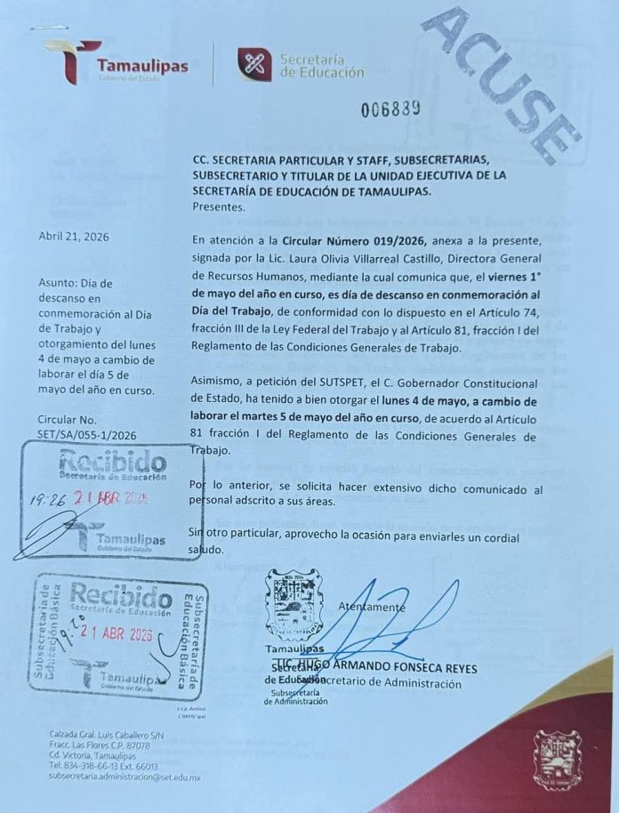 ​Ciudad Victoria, Tamaulipas – La Secretaría de Educación de Tamaulipas (SET) informó de manera oficial los ajustes al calendario laboral para el personal administrativo y de apoyo, en el marco de las conmemoraciones cívicas del mes de mayo.