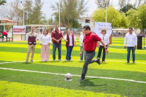 González, Tamaulipas.– La secretaria de Bienestar Social Silvia Casas González, junto al presidente municipal de González, Miguel Alejandro Zúñiga Rodríguez, dio el saque inicial de inauguración del cuadrangular femenil de fútbol “González se Transforma”, en la cancha multideportiva “Urbano Vega Gallegos”, situada en la colonia Jardín de Estación Manuel.