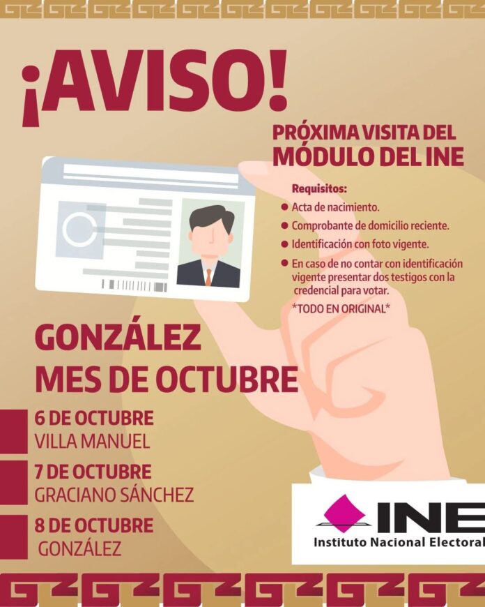 El Instituto Nacional Electoral (INE) ha anunciado las fechas y requisitos para la próxima visita de su Módulo a las comunidades de González, Villa Manuel y Graciano Sánchez durante el mes de octubre.