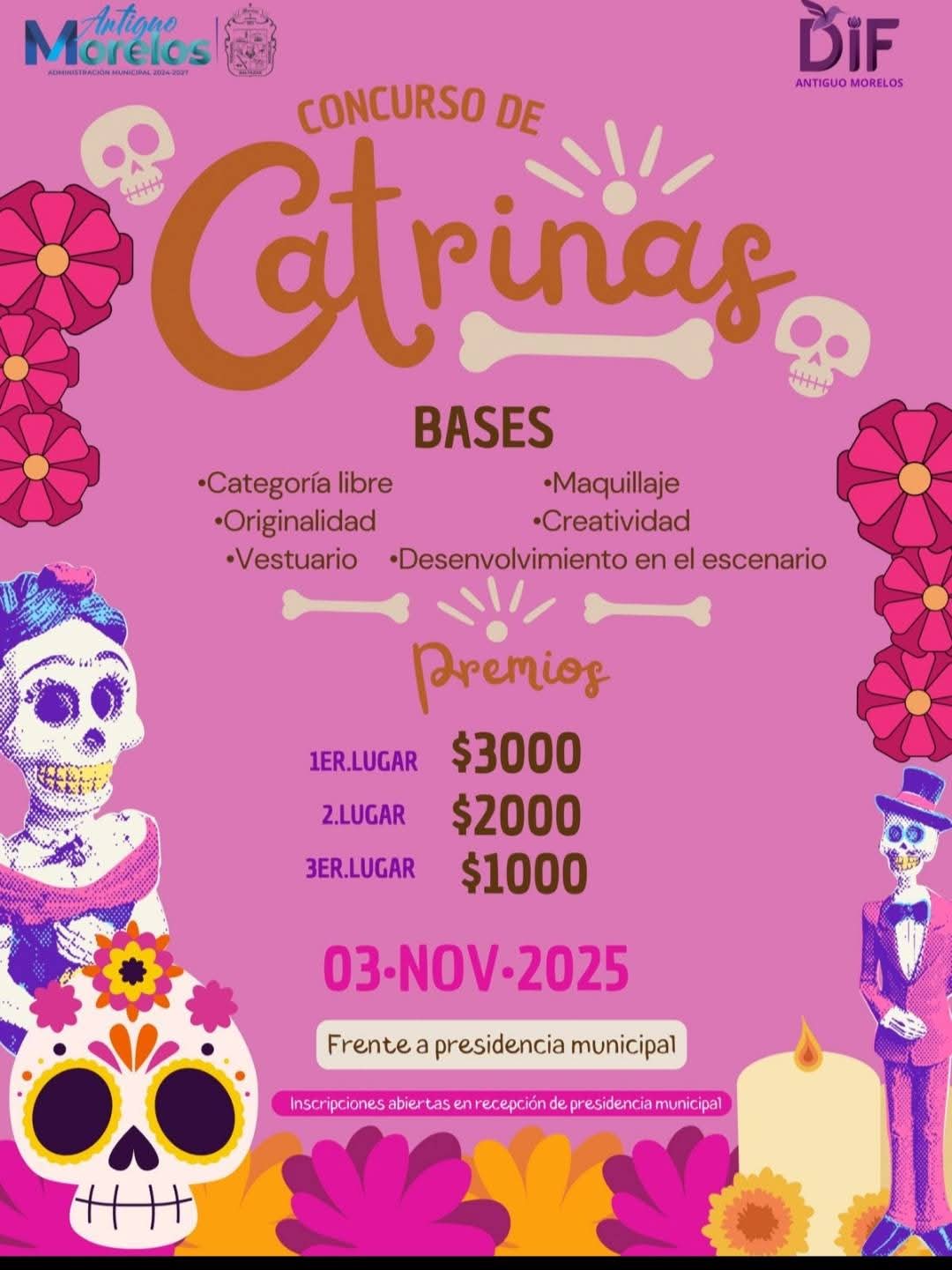 El R. Ayuntamiento de Antiguo Morelos y el Sistema DIF Municipal han lanzado una triple convocatoria para celebrar el Día de Muertos con concursos que buscan preservar y fomentar las tradiciones mexicanas, invitando a la población a participar en las actividades que se llevarán a cabo el próximo 3 de noviembre de 2025 frente a la Presidencia Municipal.