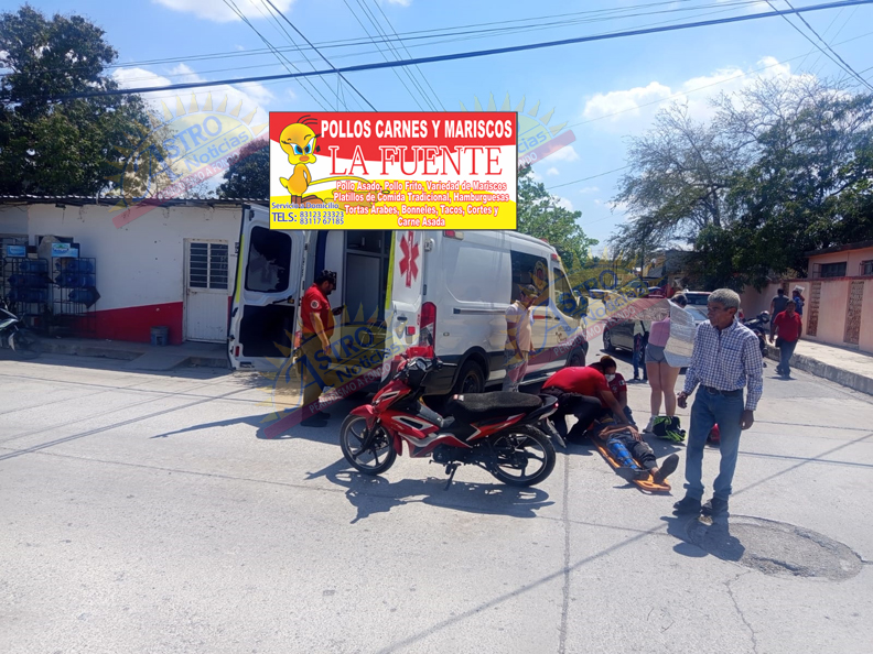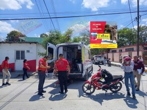 Testigos señalaron que la conductora de la camioneta presuntamente omitió el alto obligatorio, atravesándose en la trayectoria del motociclista, lo que provocó el fuerte choque que dejó al joven con severas lesiones.
