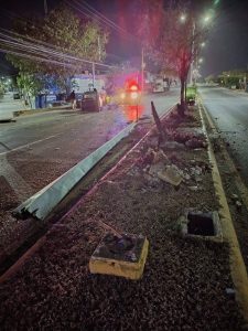 El automóvil terminó trepado en el camellón, derribando a su paso un poste de alumbrado público, una palmera y un árbol de ornato.