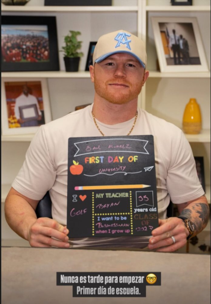 Aunque no se ha revelado de forma oficial qué carrera está estudiando el boxeador, por medio de una dinámica Canelo mostró un letrero donde dice “Yo amo el golf”, “Mi profesor es Bryan”, “Clase 2027” y “Quiero ser un hombre de negocios cuando sea mayor”.