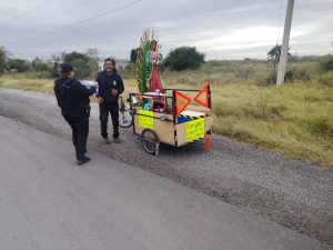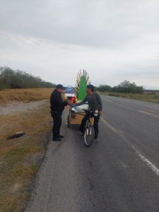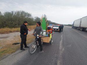 De manera simultánea, un ciudadano residente del municipio de Reynosa se dirige a El Chorrito, destino turístico ubicado en el municipio de Hidalgo, trasladando a una figura de la Virgen de Guadalupe, a bordo de una bicicleta tricarga.