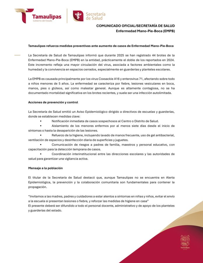 Comunicado oficial de la Secretaría de Salud con motivo de los recientes brotes de la Enfermedad Mano-Pie-Boca; dichas recomendaciones, que fueron comunicadas a estructura educativa desde el lunes pasado buscan prevenir mayor circulación del virus en todo Tamaulipas. Es importante que en casa madres y padres de familia apoyen con el cuidado de sus hijas e hijos para evitar mayor número de casos.