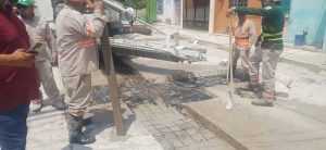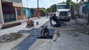 Primero, secar, una vez ya que esté seco, que en este caso aquí en esta colonia ya estamos prácticamente secos, entonces sí, ya ha venido a hacer algunos cambios de tuberías, falta la reposición y algo que ustedes pueden ver, que es lo que venimos a checar ahorita, aquí esta calle es de pavimento hidráulico, pavimento hidráulico es lo que se está reponiendo.