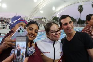 Más adelante, recorrió el Área Acuática, donde se ubica la alberca olímpica, espacio en el que observó entrenamientos de equipos formativos y conversó con madres, padres y entrenadores sobre los avances y necesidades de la disciplina.