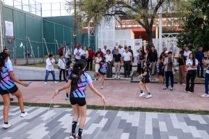 Su primer punto fueron en las nuevas canchas techadas de básquetbol, donde presenció los partidos de niñas y niños que forman parte de escuelas y academias locales.