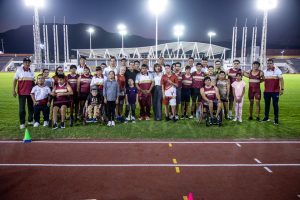 Antes de concluir su visita en esta unidad, saludó a jóvenes practicantes de Tochito Bandera y presenció entrenamientos en la pista de atletismo, donde atletas de diferentes edades realizan sesiones diarias de preparación.