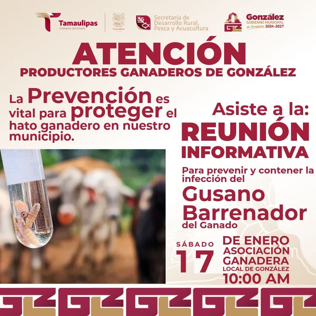 Con el firme compromiso de salvaguardar el patrimonio de las familias del campo, el Gobierno Municipal encabezado por el Dr. Miguel Alejandro Zuñiga Rodríguez invita a todos los productores ganaderos de la región a una reunión informativa estratégica sobre la prevención y control del Gusano Barrenador del Ganado.