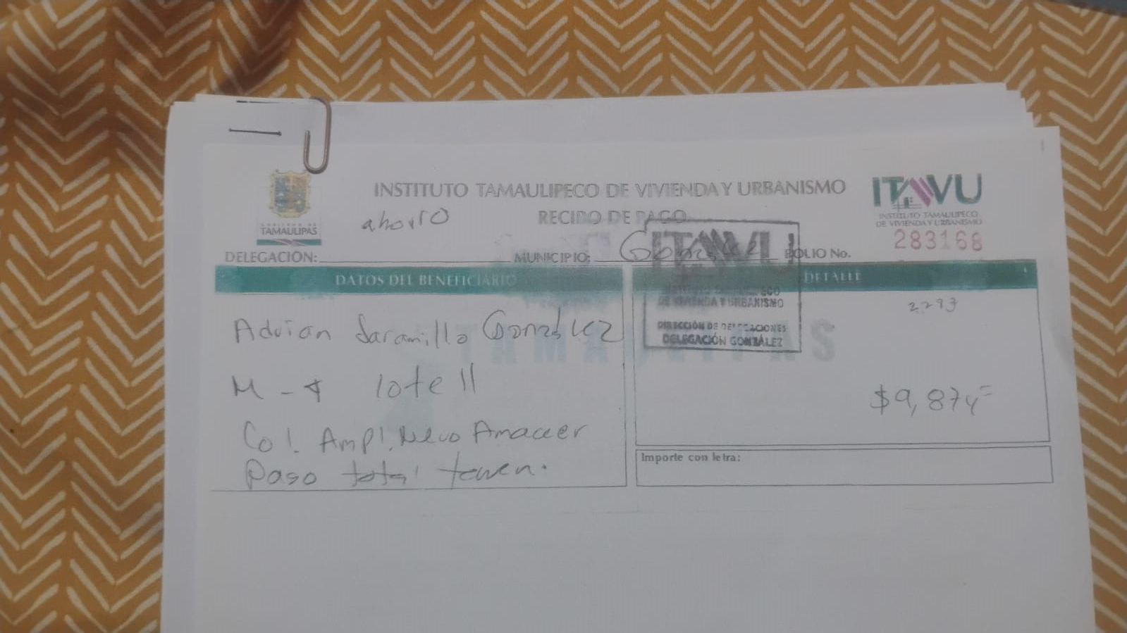Originalmente, el terreno fue pagado por Adrian Jaramillo González, su hermano liquidando la totalidad del lote hace mas de 12 años, pagando $ 9, 874.00 pesos finiquitando su adeudo con el ITAVU.