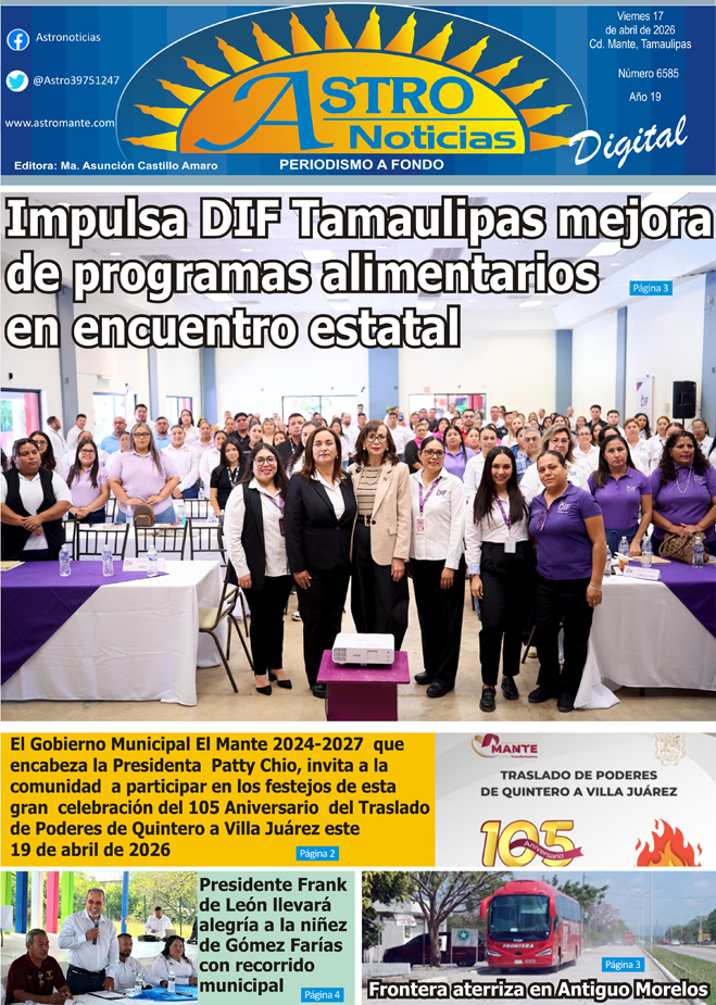 Estimable lector le presentamos la versión digital de su periódico #Astronoticias edición 17 abril de 2026 #Tamaulipas #ElMante #Tampico #CdVictoria #Altamira #CiudadMadero #Reynosa #Matamoros #Xicotencatl #RioBravo #ValleHermoso #NuevoLaredo #Dallas #SanAntonio #NuevoLeon |