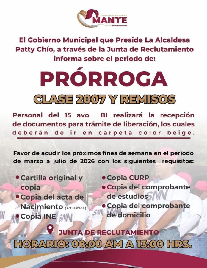 A través de la Junta de Reclutamiento, y por indicaciones de la alcaldesa Patty Chío, se da a conocer la prórroga para la Clase 2007 y remisos.