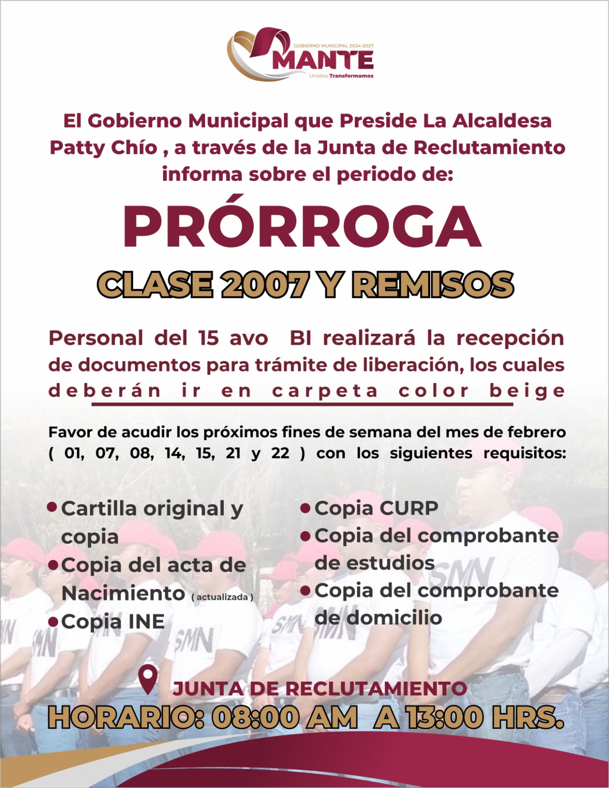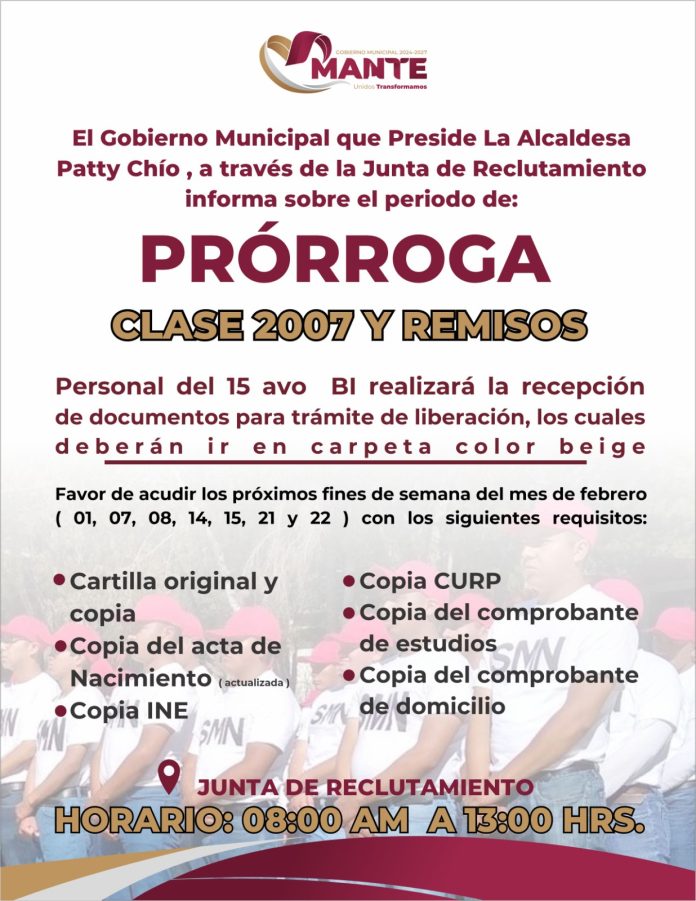 El Gobierno Municipal de El Mante 2024–2027, que preside la alcaldesa Patty Chío, a través de la Junta Municipal de Reclutamiento, informa a los jóvenes de la Clase 2007 y Remisos sobre el periodo de prórroga para el trámite de liberación de la Cartilla del Servicio Militar Nacional. El responsable de la Junta de Reclutamiento, Carlos Márquez Quilpas, invitó a los jóvenes a aprovechar esta prórroga y cumplir en tiempo y forma con este importante trámite, que brinda certeza jurídica y es requisito para diversos procesos administrativos. Detalló que personal del 15/o Batallón de Infantería realizará la recepción de documentos, los cuales deberán entregarse en carpeta color beige, durante los fines de semana del mes de febrero: 01, 07, 08, 14, 15, 21 y 22, en un horario de 08:00 a 13:00 horas, en las instalaciones de la Junta de Reclutamiento. Los requisitos solicitados son: cartilla original y copia, acta de nacimiento actualizada, copia de INE, CURP, comprobante de estudios y comprobante de domicilio. El Gobierno Municipal refrenda su compromiso de brindar atención cercana y facilitar los trámites a la juventud mantense.