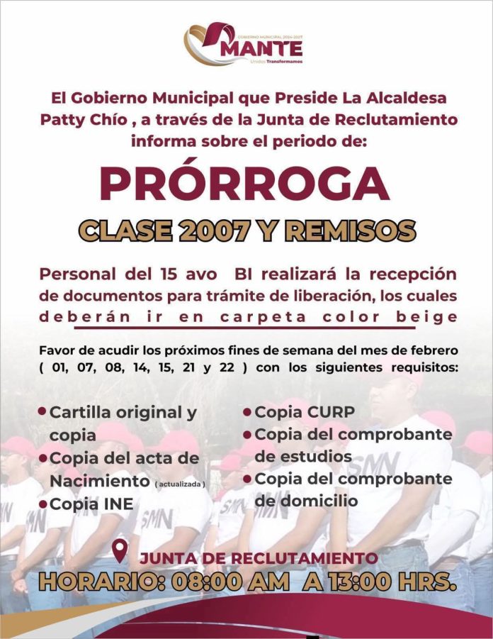 El Gobierno Municipal de El Mante 2024-2027, que preside la alcaldesa Patty Chío, a través de la Junta Municipal de Reclutamiento, informa a los jóvenes de la Clase 2007 y remisos sobre el periodo de prórroga para el trámite de liberación de la Cartilla del Servicio Militar Nacional. El personal del 15/o. Batallón de Infantería realizará la recepción de documentos, los cuales deberán entregarse en carpeta color beige. Fechas de recepción: 08, 14, 15, 21 y 22 de febrero. Lugar: Junta Municipal de Reclutamiento. Horario: de 08:00 a 13:00 horas. Requisitos: Cartilla original y copia. Copia del acta de nacimiento actualizada. Copia de INE. Copia de CURP. Copia del comprobante de estudios. Copia del comprobante de domicilio. Se invita a los interesados a realizar su trámite en tiempo y forma.
