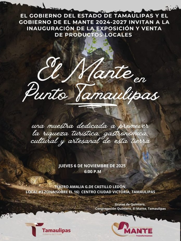 ​El Gobierno del Estado de Tamaulipas y el Gobierno de El Mante 2024-2027 tienen el honor de invitar a la ciudadanía a la inauguración de la exposición y venta de productos locales “El Mante en Punto Tamaulipas”.
