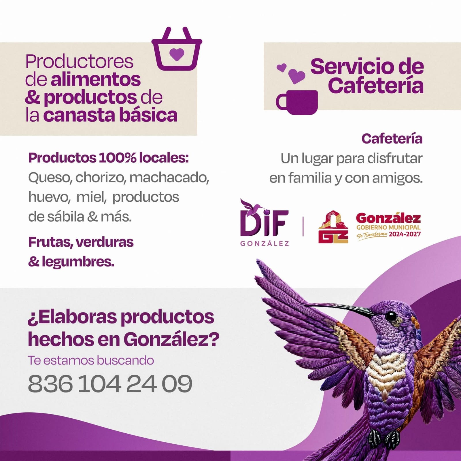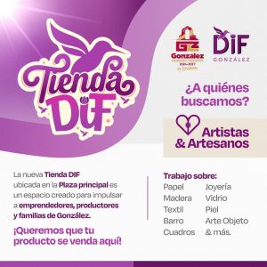 Con el objetivo de impulsar el talento local y fortalecer la economía de las familias gonzalenses, el Sistema DIF González invita a artistas, productores y artesanos a formar parte de la TIENDA DIF, un espacio creado para exhibir y comercializar productos elaborados en el municipio.