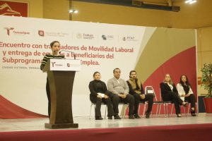En el evento participaron la subsecretaria de Empleo y Productividad Laboral, Carolina Iveth Martínez Molano; el director del Servicio Nacional del Empleo en Tamaulipas, Emanuel Reséndez Gómez; la gerente estatal de FINABIEN Tamaulipas, Vanesa Berenice Lara Solís; así como Samantha Aguilar García, participante del Programa de Trabajadores Agrícolas Temporales, y Blanca Alicia Guevara Macías, beneficiaria del subprograma Tamaulipas Emplea, en su vertiente Tamaulipas Equipa.