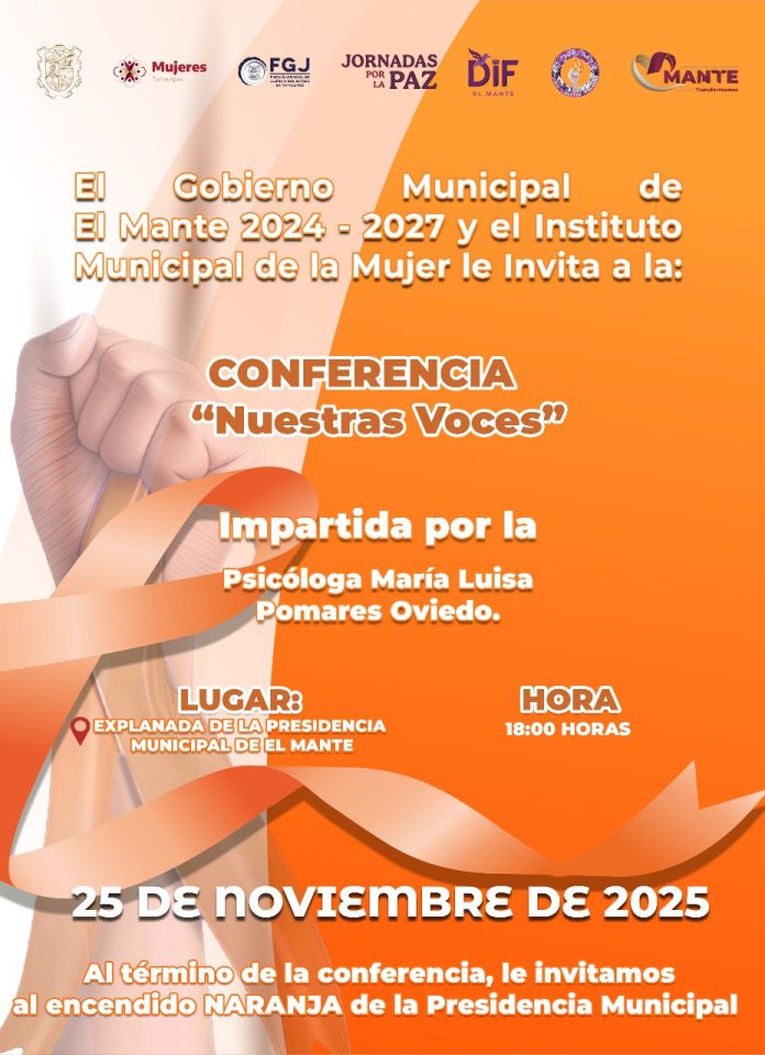 En coordinación con el Instituto Municipal de la Mujer que encabeza Martha Alonso, se llevará a cabo la conferencia “Nuestras Voces”, impartida por la psicóloga María Luisa Pomares Oviedo, como parte de las acciones impulsadas para conmemorar el Día Internacional de la Eliminación de la Violencia contra las Mujeres y las niñas.