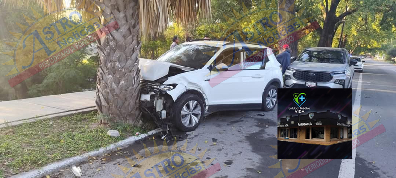 En Ciudad. Victoria….Un aparatoso accidente vial se registró la tarde de este jueves en el cruce de las calles 13 y 14 “Praxedis Balboa”, luego de que una camioneta terminó impactándose contra una palmera tras colisionar previamente con un automóvil que presuntamente le cerró el paso.