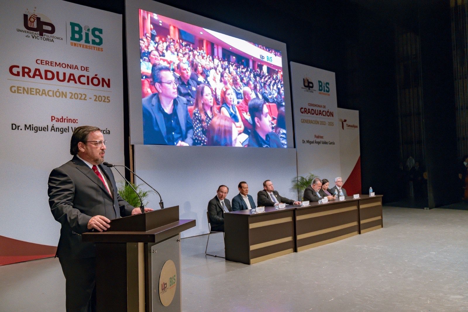Ciudad Victoria, Tamaulipas.– Poner al servicio de la sociedad sus conocimientos, capacidades y talentos desarrollados durante su formación profesional, fue el llamado que hizo Miguel Ángel Valdez García, secretario de Educación de Tamaulipas, a las y los graduados de las diferentes carreras que conforman la Generación 2022–2025 de la Universidad Politécnica de Victoria (UPV), de la cual fue padrino.