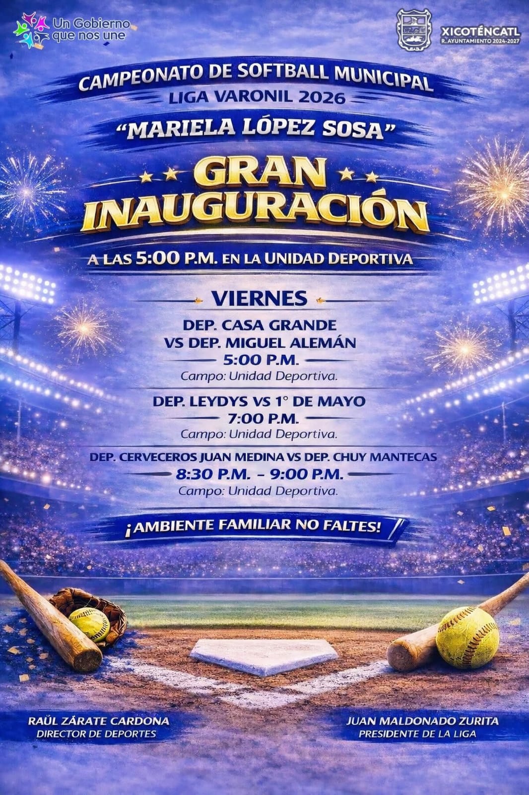 Este viernes se llevará a cabo la gran inauguración del Campeonato de Softball Municipal, Liga Varonil 2026 “Mariela López Sosa”, evento que tendrá lugar a partir de las 5:00 de la tarde en la Unidad Deportiva.