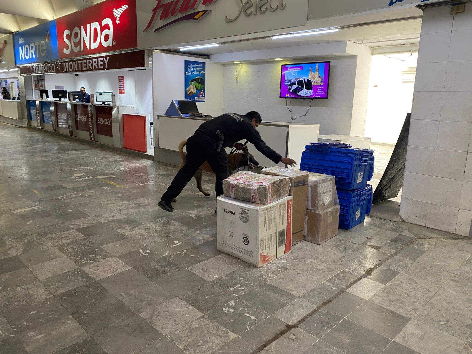 Ciudad Victoria, Tamaulipas.– Como parte de las acciones de prevención y disuasión del delito, personal de la Dirección de Agrupamientos Policiales de la Guardia Estatal lleva a cabo un operativo de inspección en la Central de Autobuses, con el apoyo de un binomio canino especializado en la detección de narcóticos.