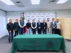 Durante esta agenda de trabajo, Camacho Nieto estuvo acompañado por el subsecretario de Desarrollo Sostenible y Comercio Exterior, Sergio Carlos Guajardo Castellanos, así como por el director de Exportaciones, Conectividad y Logística, José María Hernández Gómez.