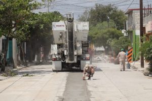 * Después de atender el severo problema de aguas negras mediante la inversión en la rehabilitación del colector, repone pavimento con la concretera móvil.