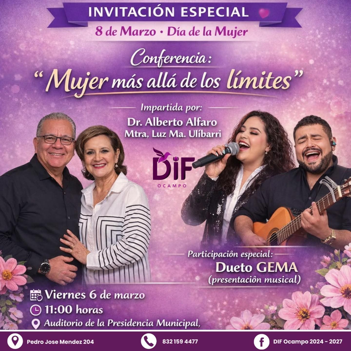 En el marco del 8 de Marzo, Día Internacional de la Mujer, el Sistema DIF Ocampo llevará a cabo la conferencia “Mujer: Más Allá de los Límites”, un espacio dedicado a la reflexión, inspiración y reconocimiento de la fuerza, talento y liderazgo femenino en la comunidad.