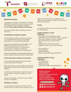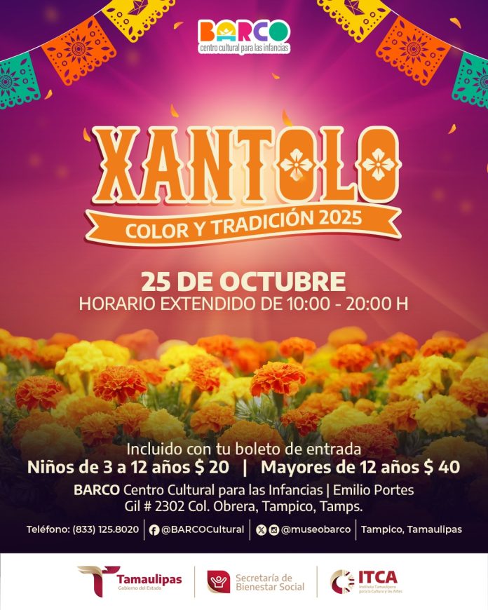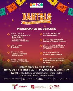 Tampico, Tamaulipas.-Para conmemorar el Día de Muertos, una de las celebraciones más emblemáticas de México; el Gobierno del Estado de Tamaulipas, a través del Instituto Tamaulipeco para la Cultura y las Artes y el centro cultural para las infancias BARCO, llevará a cabo una jornada de actividades culturales, artísticas y familiares en el sur del estado, por lo que invitan a las comunidades de Tampico y municipios cercanos a participar en las diversas actividades como el Concurso de Mini Altares.
