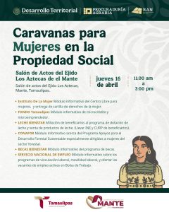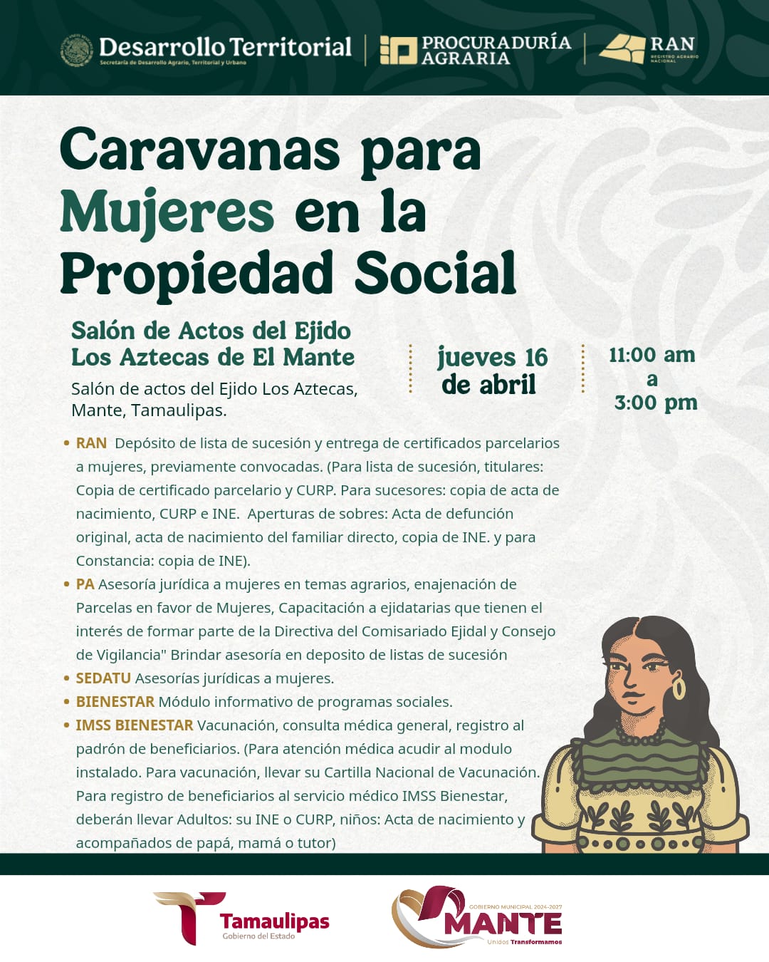 El Gobierno Municipal de El Mante 2024-2027, en coordinación con la Secretaría de Desarrollo Agrario, Territorial y Urbano (SEDATU), la Procuraduría Agraria y el Registro Agrario Nacional (RAN), invita a todas las mujeres que habitan en ejidos y comunidades agrarias a participar en esta jornada integral de atención y servicios.