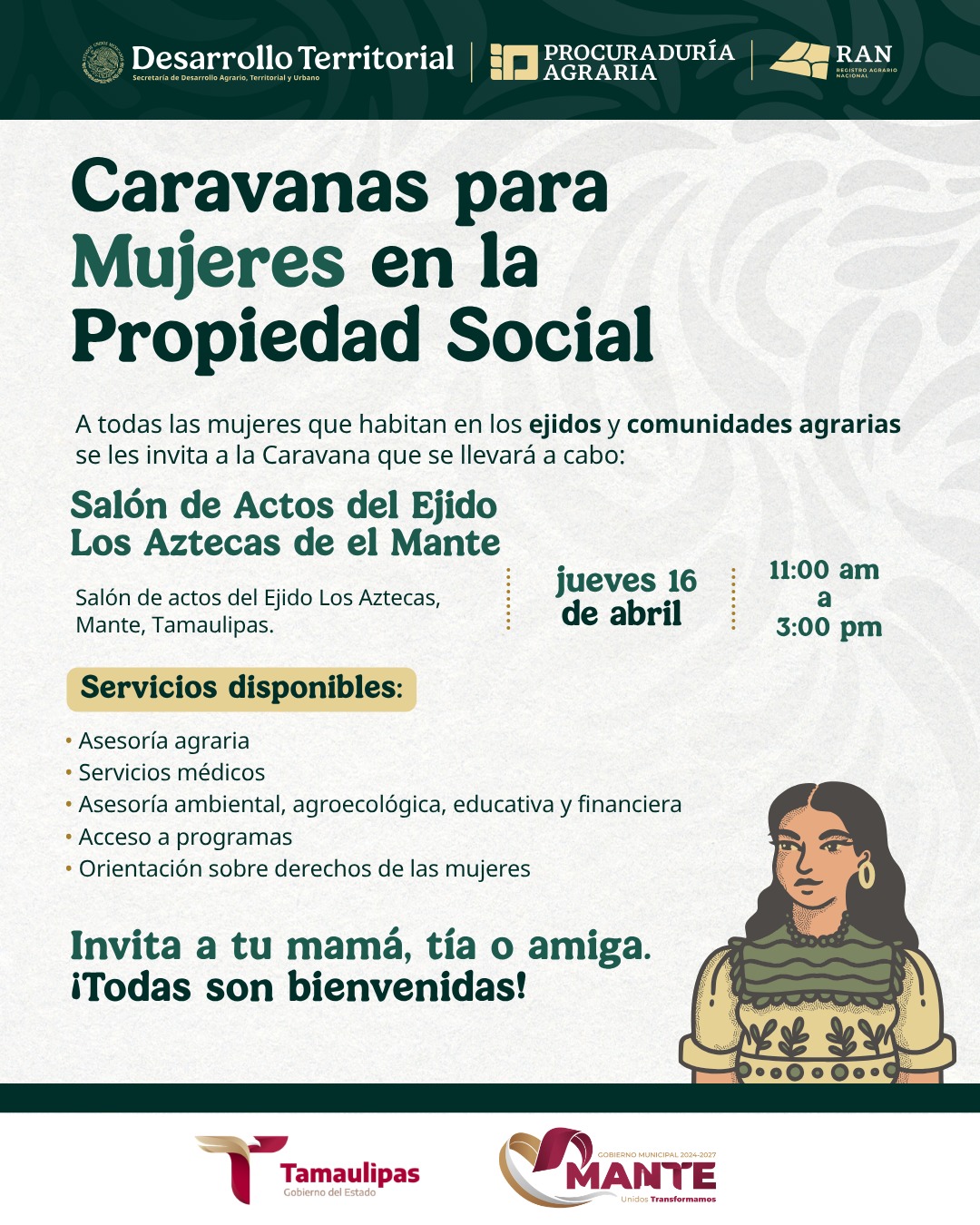 El Gobierno Municipal El Mante 2024-2027, presidido por Patty Chío, en coordinación con la Secretaría de Desarrollo Agrario, Territorial y Urbano (SEDATU), la Procuraduría Agraria y el Registro Agrario Nacional (RAN), convoca a todas las mujeres de ejidos y comunidades agrarias a participar en este encuentro integral.