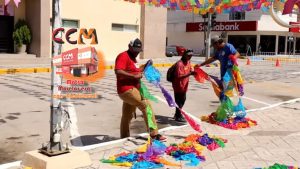 Se trabaja en la Colocación de grandes cantidades de papel picado de colores, extendido sobre las calles y colgado en hileras, gracias al apoyo de personal utilizando una grúa para la colocación de la decoración, así como en el montaje de estructuras blancas como gradas para un escenario).
