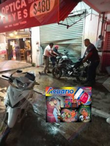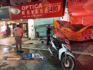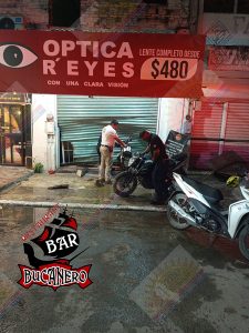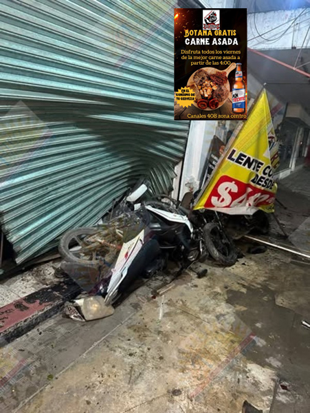 Las pobres motos dos Italikas 110 y una Honda motoneta, propiedad de René González Martínez y José Macario Castro Martínez volaron directo contra la cortina de acero de un local de lentes y armazones, que quedó como acordeón viejo.