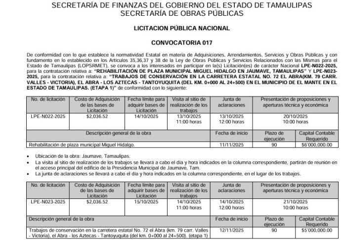 Específicamente se trata de la LPE-N023 2025, para la contratación relativa a: “TRABAJOS DE CONSERVACIÓN EN LA CARRETERA ESTATAL NO. 72 EL ABRA (KM. 79 CARR. VALLES – VICTORIA), EL ABRA – LOS AZTECAS – TANTOYUQUITA (DEL KM. 0+000 AL 24+500) EN EL MUNICIPIO DE EL MANTE EN EL ESTADO DE TAMAULIPAS. (ETAPA 1), al parecer será la primera fase desde el Abra al ejido Celaya.