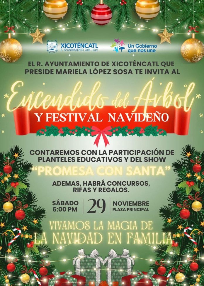 El R. Ayuntamiento de Xicoténcatl, bajo la presidencia de Mariela López Sosa, tiene el honor de invitar a toda la ciudadanía a su gran evento de encendido del árbol y Festival Navideño, con el cual se da inicio formal a las celebraciones de la temporada.