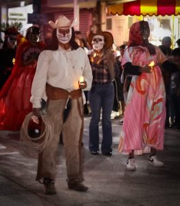 La celebración comenzó con la procesión de catrinas y catrines, participantes del concurso convocado por el Gobierno Municipal, junto a la cuadrilla de danzantes del ejido Ojo de Agua, quienes encabezaron el recorrido hasta la plaza principal.