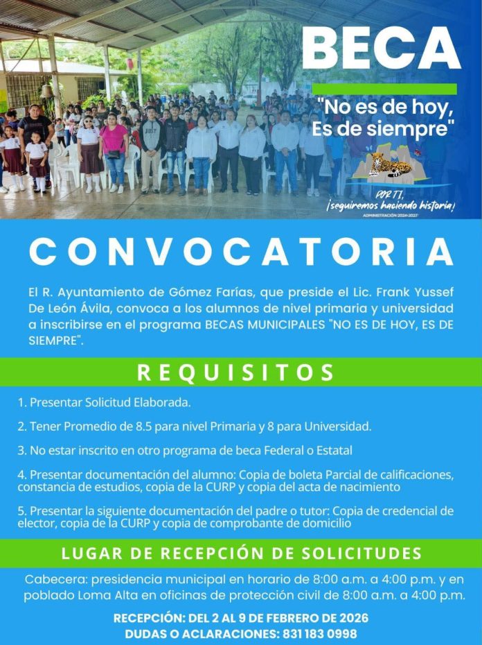 El compromiso con la niñez y la juventud de Gómez Farías sigue firme. Bajo el liderazgo del alcalde, el Lic. Frank Yussef De León Ávila, el R. Ayuntamiento reafirma que el impulso al estudio es una prioridad constante con el lanzamiento de la convocatoria de Becas Municipales: “No es de hoy, es de siempre”.