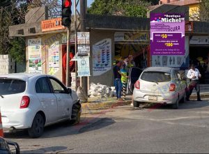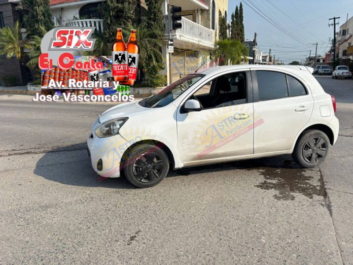 En el lugar un automóvil Nissan March color blanco impactó a otro de la misma línea pero en color gris, el cual por el golpe salió proyectado contra los postes de contención de la ferretería.