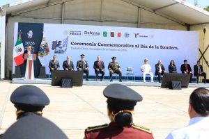 Durante el evento cívico, que incluyó un enlace con la ceremonia encabezada por la presidenta Claudia Sheinbaum Pardo, y en el cual también se izó la bandera del Cerro del Aura, el mandatario estatal, quien hizo entrega del lábaro patrio para su guarda y custodia a cinco escuelas, reafirmó el compromiso de las nuevas generaciones con los valores y símbolos patrios.