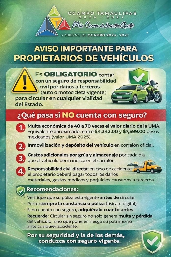 ​OCAMPO, TAMAULIPAS. – El Gobierno Municipal de Ocampo 2024-2027 emitió un aviso importante dirigido a todos los propietarios de vehículos y motocicletas, recordando que es obligatorio contar con un seguro de responsabilidad civil por daños a terceros para transitar por cualquier vialidad del estado.