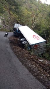 En Ocampo, Tamaulipas.. Lo resbaladizo del pavimento provoco que la segunda caja de una trailer volcara sobre la carretera Ocampo–Mante, está mañana.