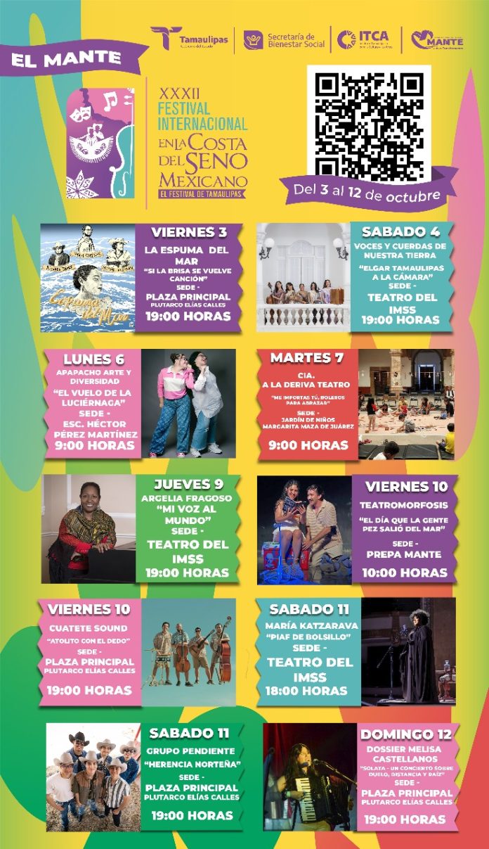 Bajo el apoyo del Instituto Tamaulipeco para la Cultura y las Artes, del 3 al 12 de octubre, la fiesta del arte llega a El Mante y el resto de los municipios de la entidad con el apoyo indiscutible del Gobernador Américo Villarreal Anaya.