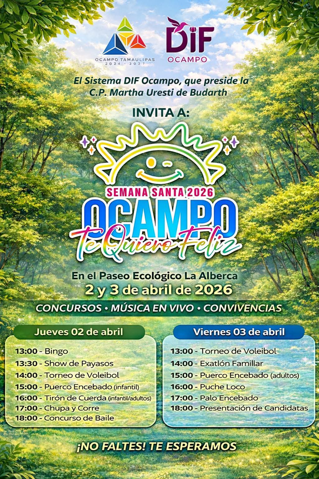 OCAMPO, TAM.– Con el objetivo de fortalecer los lazos comunitarios y ofrecer espacios de sano esparcimiento para las familias locales y visitantes, el Sistema DIF Ocampo, presidido por la C.P. Martha Uresti de Budarth, invita a las festividades de “Semana Santa 2026: Ocampo Te Quiero Feliz”.